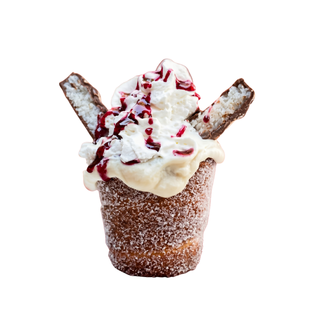 A Tschimney töltött kürtőskalácsai igazi ínyencségek: belsejüket Nutellával kenjük meg, majd házi készítésű vanília- vagy csokoládé lágyfagylalttal töltjük meg. A tetejére ízlés szerint kerülhet tejszínhab, csokoládé vagy más édes feltét. Mindezt Budapest belvárosában található üzleteinkben élvezheted, frissen elkészítve.